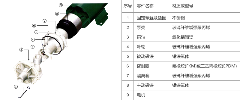 MPH型塑料磁力泵符合JB/T7742-1995《小型磁力傳動離心泵》標(biāo)準(zhǔn),過流部件采用聚苯硫醚(PPS),不受大多數(shù)酸、堿、鹽的侵蝕(除氧化性酸如濃硫酸、硝酸和王水等),其性能接近于聚四氟乙烯的化學(xué)性能,在100℃以下能耐大多數(shù)有機(jī)溶劑,特別能耐汽油和甲醇的混合液,是酸堿工業(yè)中的理想用泵。